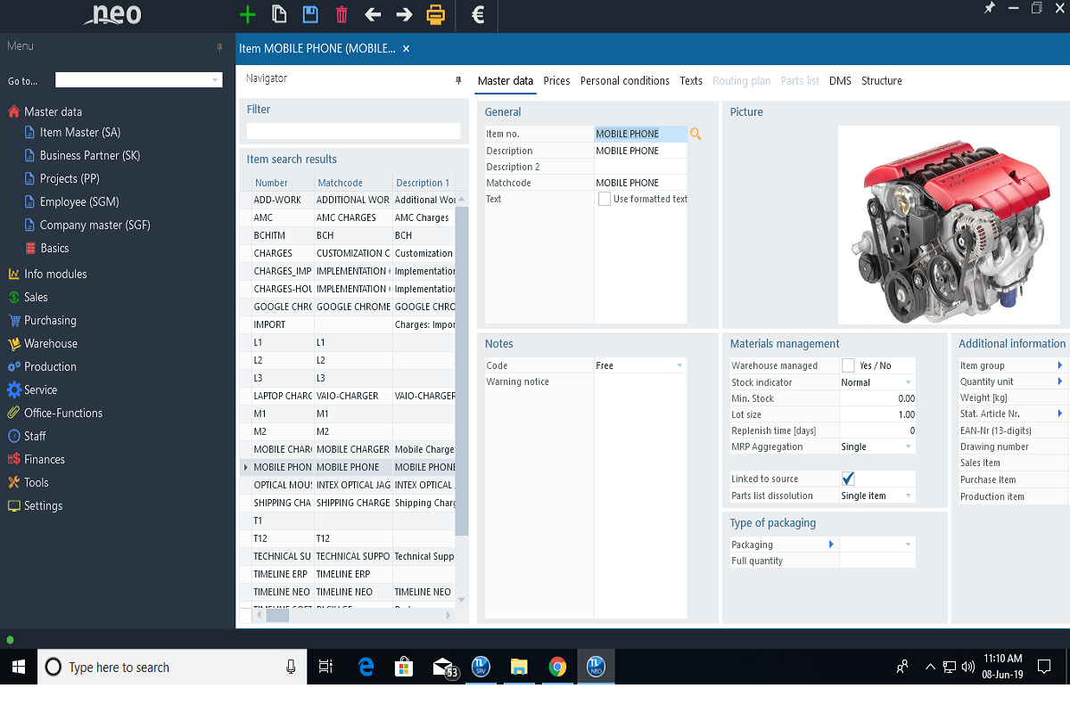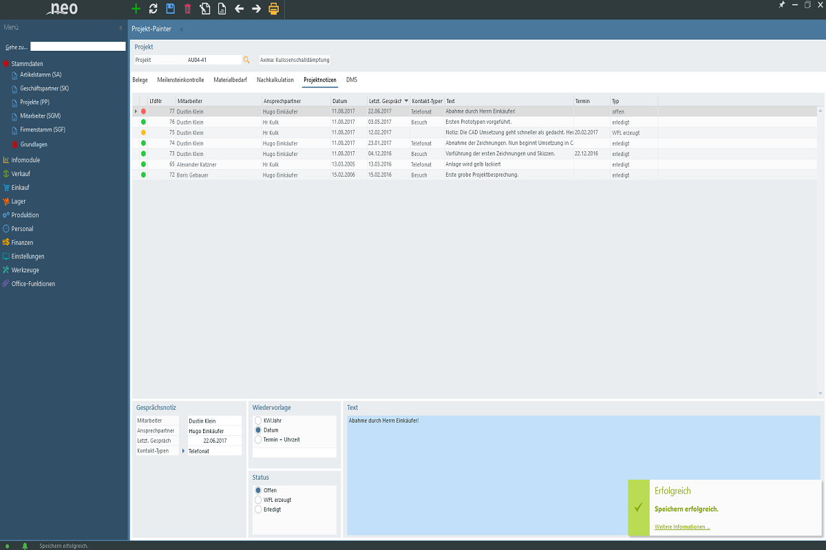Other documents concerning purchase and sales can be centrally created, as well as previous article calculations or production orders. For all production orders summarized here, you can see at a glance all the material requirements as well as an indication of whether they can be covered by purchasing or production.Communication with the customer can also take place in project related activities, project notes. Similar as with the case of the customer, phone calls, emails or visits can be recorded and documents imported into the DMS.