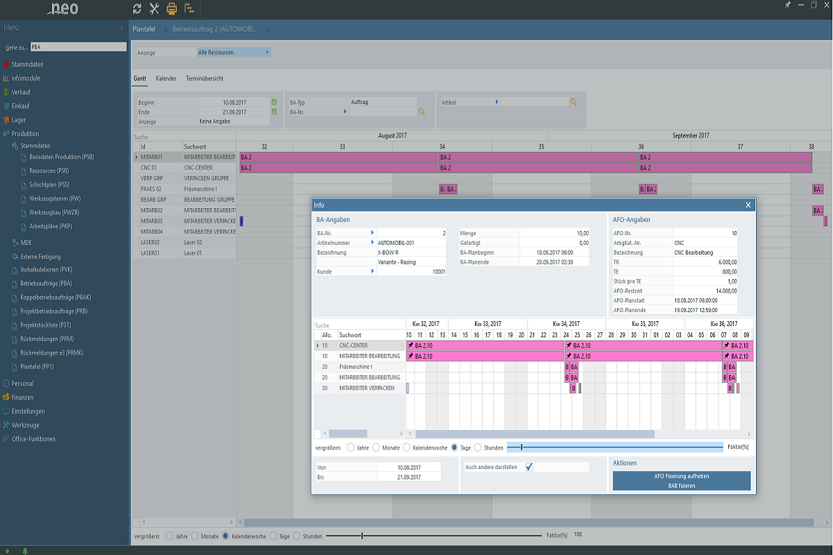 Gantt planning is used for scheduling and provides ideal support for determining any resource bottleneck. This also gives you a better overview of machine, resource and employee utilization within the company. The details of the selected work order are displayed with a right-click, and you can see the entire order or individual work sequences, so that these deadlines are not breached when re-planning. You can display each individual resource in a daily, weekly or monthly overview in the planning calendar.