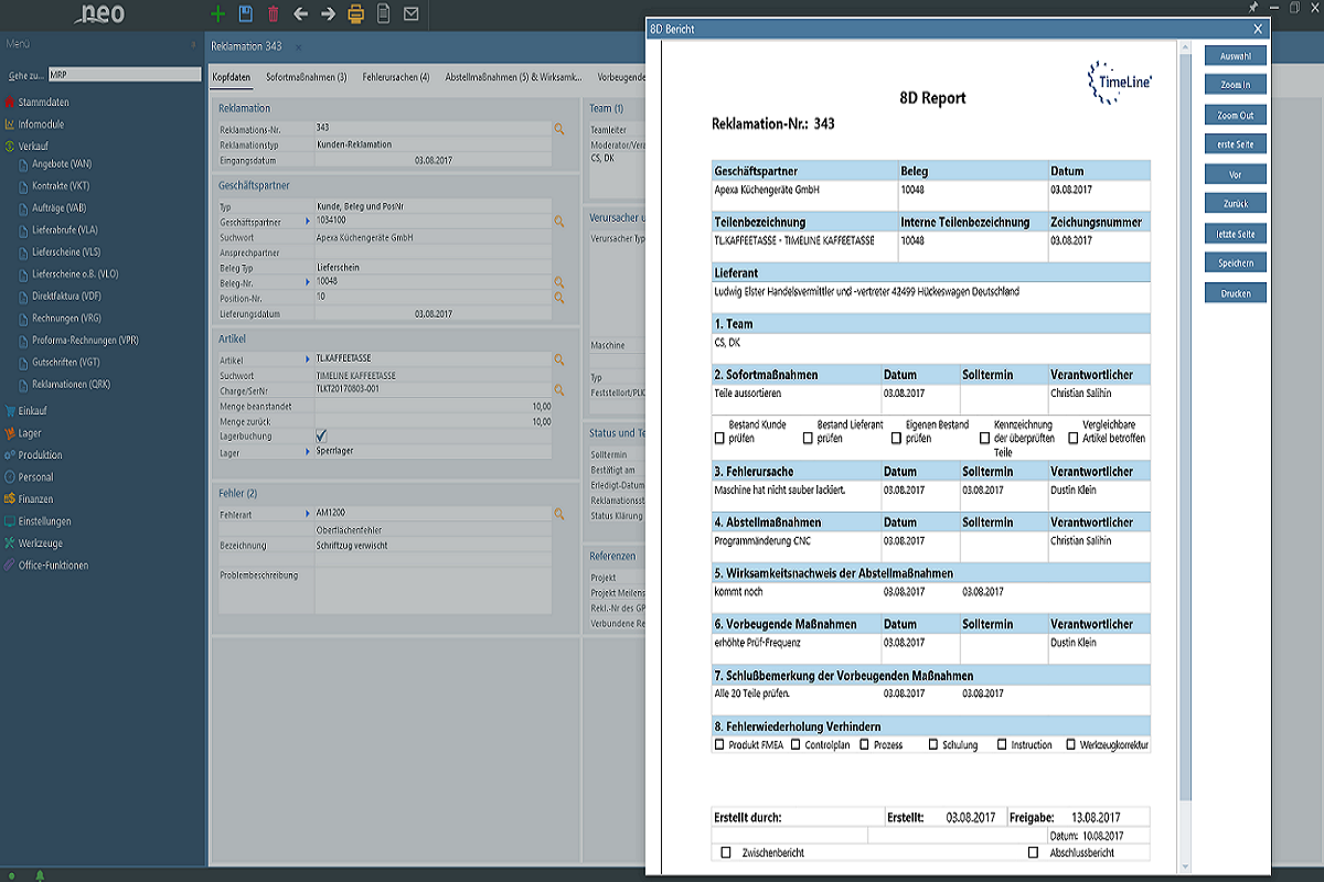 Should a customer complain about goods, with the complaint and the integrated 8D report you have the possibility to react directly in terms of quality assurance. In doing so, you simply assign the complaint to the customer document and note the quantity complained about. The eight necessary process steps for the processing of a complaint are now carried out as part of the quality management procedure. To do this, you define a team, document the description of the problem, establish the immediate measures and determine the causes of the errors, plan the remedial measures and implement these. At the end, you still have options for repeating the error and exchange experiences with each other.