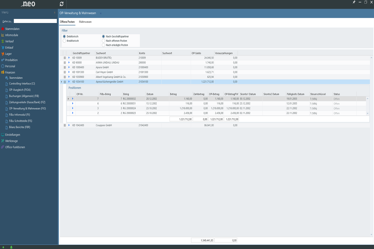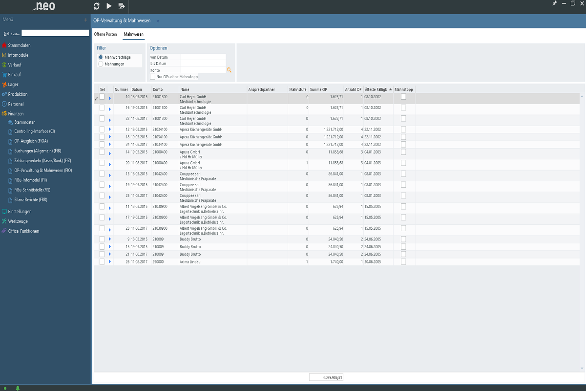 Concerning reminders, you can have the system generate automated reminder proposals. To do so, you specify how many days the due date must be exceeded and, to increase the reminder level, the maximum time allowed to pass after the last reminder. Credits and invoices can be offset conveniently against each other. Afterwards, all proposals are displayed in a table view and can then be selectively managed as individual reminders. These can then be printed out as usual or sent directly to the customer by email.