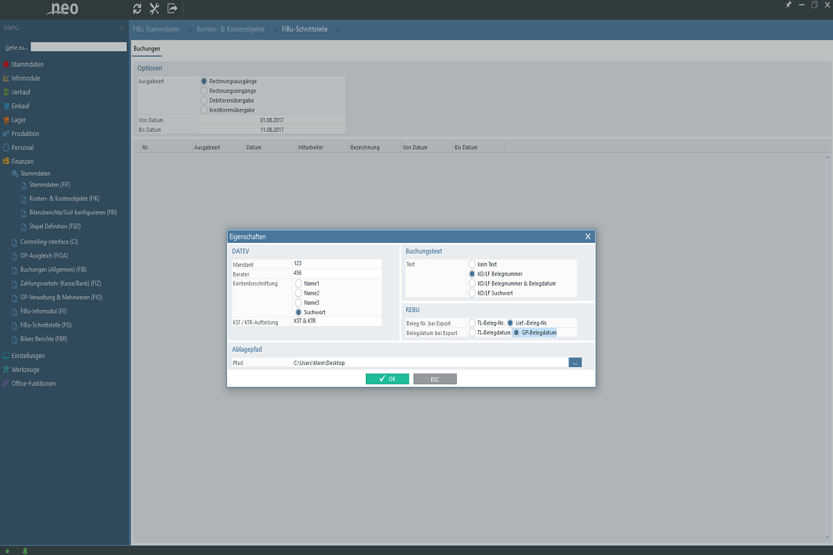Since you can already seamlessly access purchasing and sales data in the system, you can also make this data available to the financial accounting department or to your tax accountant. We currently offer three different export formats: DATEV and DATEV XML, as well as a Lexware interface, are fully integrated and allow you to export all relevant data, including creditor and debtor numbers, accounts for expenses and revenues as well as VAT and pre-tax accounts.