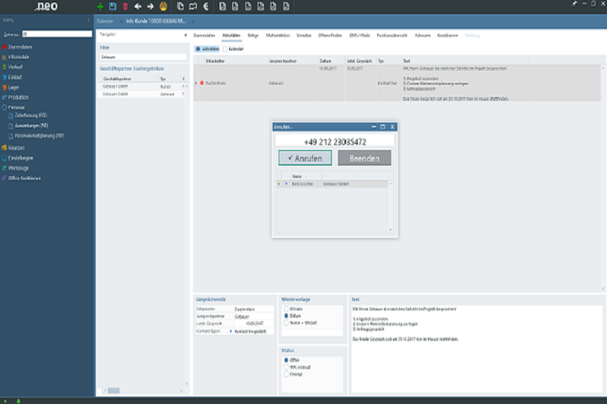 With our phone interface, you can immediately assign incoming calls to the appropriate business partner. With just one click, you can accept the call and end it. With the shortcut, you reach the contact person immediately and are able to record activities, appointments or notes concerning the conversation. Within the software, double-clicking on a phone number field suffices to call the desired contact directly. The annoying entry of phone numbers is therefore completely dispensed with.