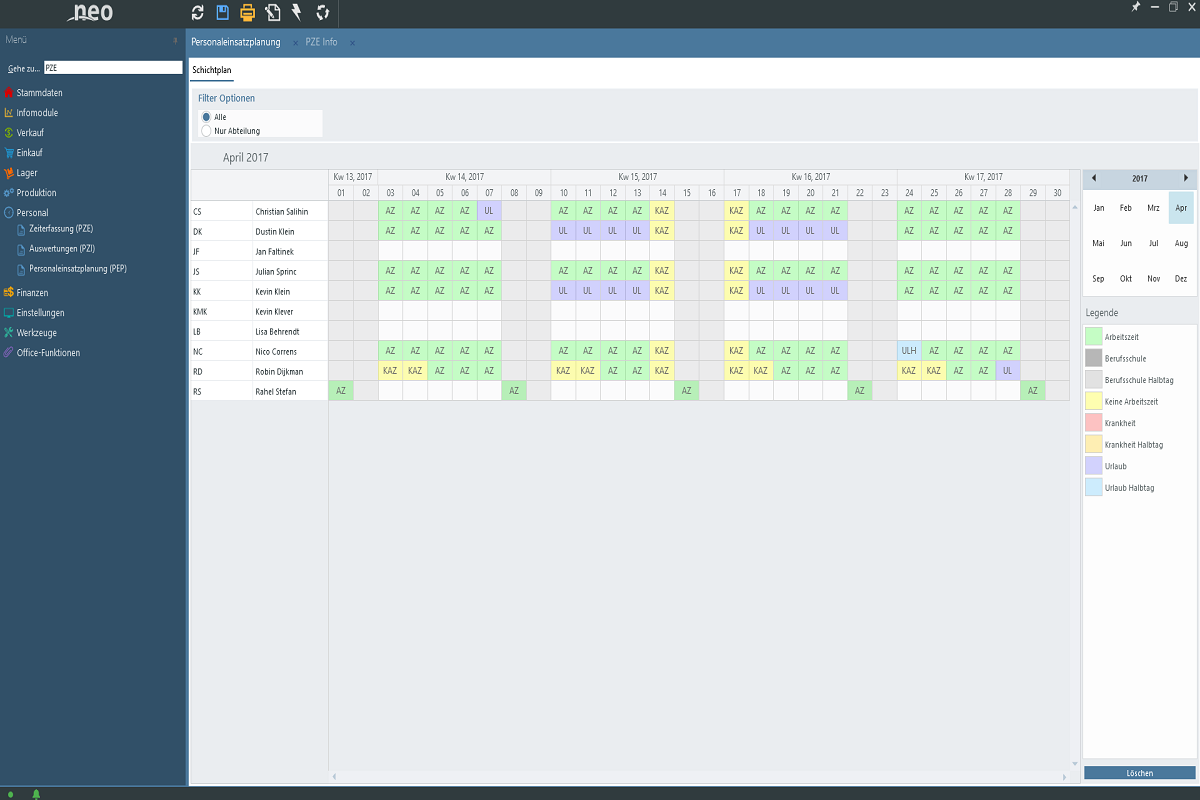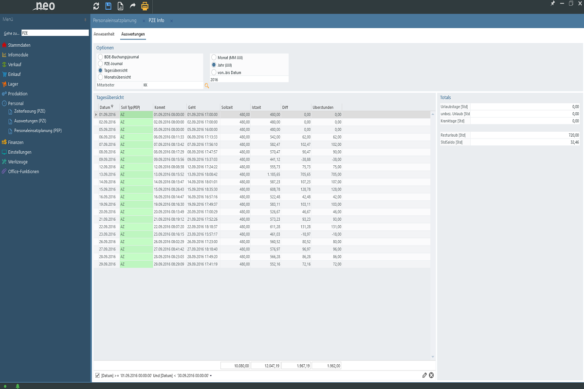 With personnel deployment planning you can define your shifts and working hours, as well as holidays and sick leaves. You can then generate shifts of any type for several employees, directly over a freely definable period of time. Target times created in this way are the basis for further personnel time recording. Sick leave and holidays captured this way can be printed out directly for payroll accounting. This means that the Excel lists used so frequently are a thing of the past.