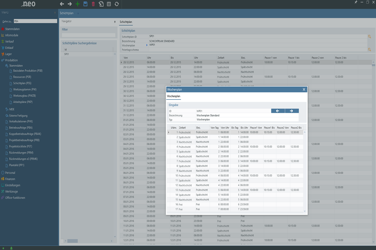 You can create and manage any number of shifts in the system,including different break times and different holiday schedules,depending on the federal state. Shifts can be assigned to employees and machines and created using a rolling weekly schedule. A percentage utilization level can also be established per resource, thus allowing a finite capacity plan to be carried out. Alternatively, this calculation can also be done by infinite or bottleneck-determined capacities.