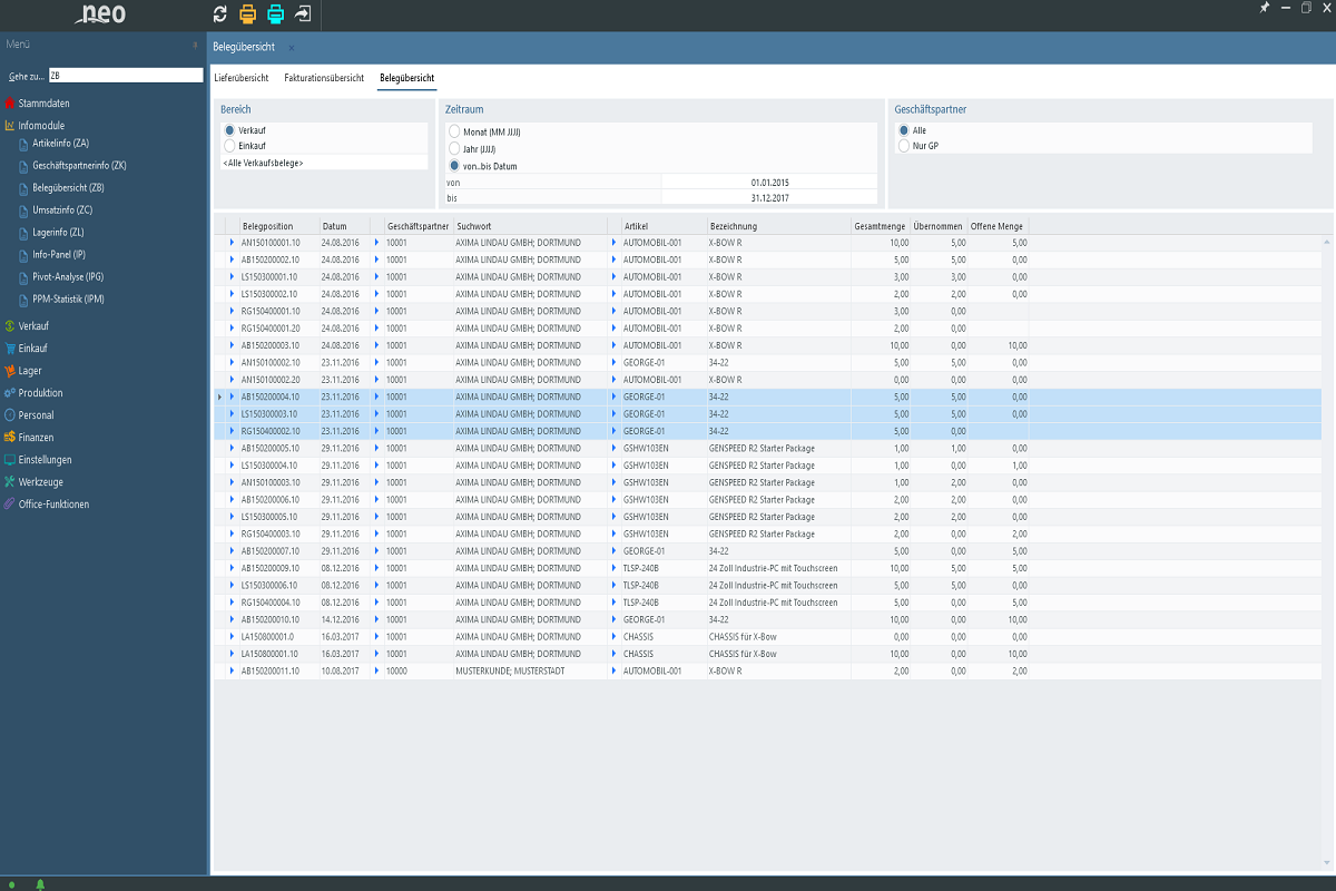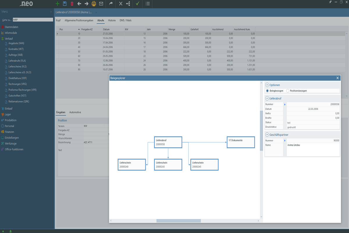 You off course, all the time have the possibility to create all relevant and necessary documents. This includes quotations, order confirmations, partial and collective delivery notes (even without billing for the dispatch of samples or replacements), partial and grouped invoices, direct invoices and credit notes. The invoice also gives you the possibility of creating pro forma, partial and final invoices. The complete document flow is displayed clearly in a document explorer.